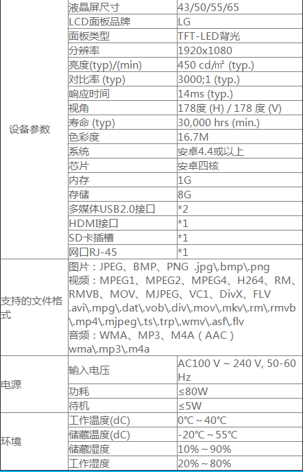廣告機產品參數: